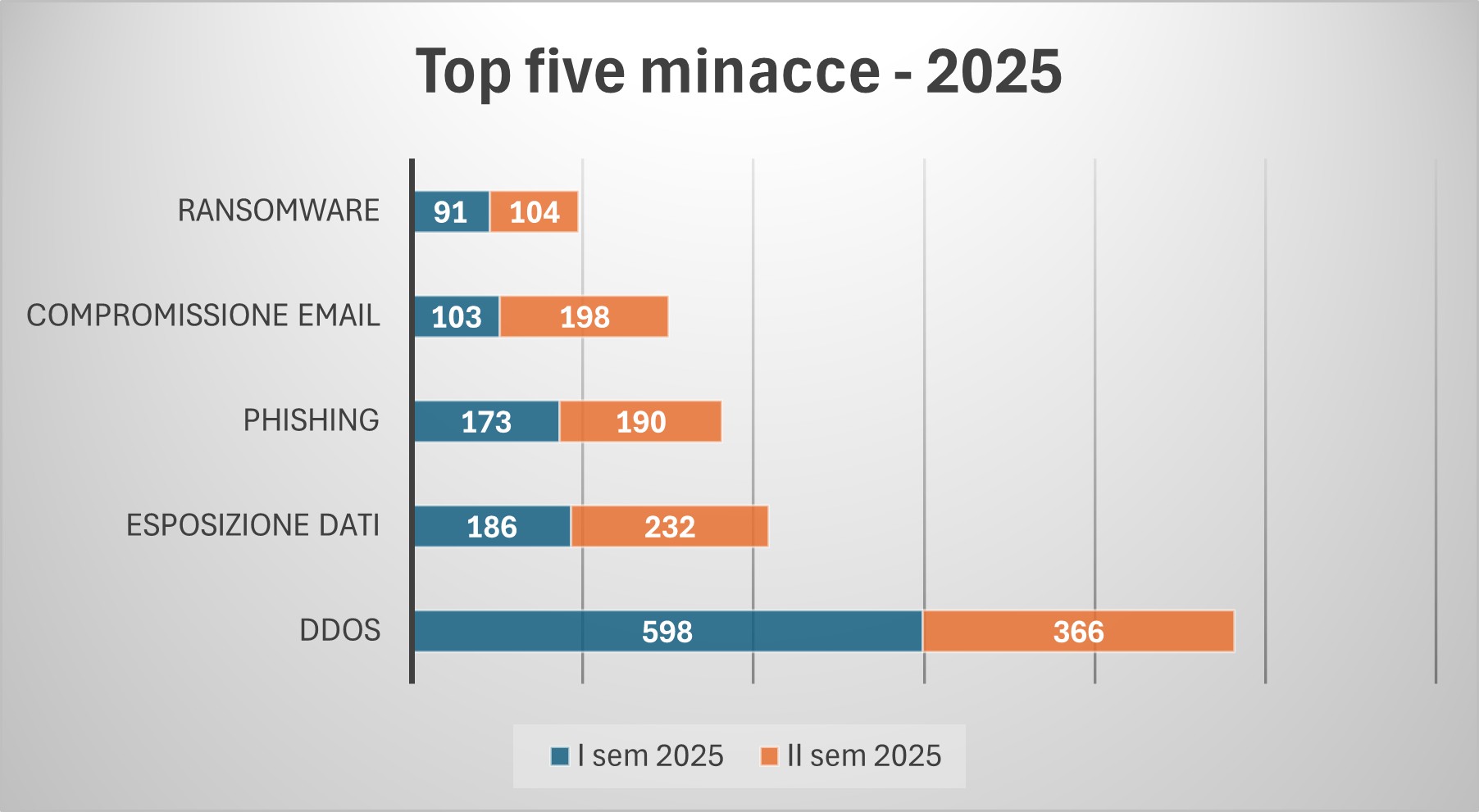 Questo lieve incremento non segnala necessariamente un peggioramento della postura di sicurezza, ma riflette piuttosto una maggiore efficacia nella classificazione degli eventi. Nel secondo semestre, infatti, molti eventi a basso impatto – come tentativi di phishing non riusciti o campagne DDoS rapidamente mitigate – vengono gestiti prima di produrre effetti significativi, mentre l’attenzione si concentra su eventi più qualificati.